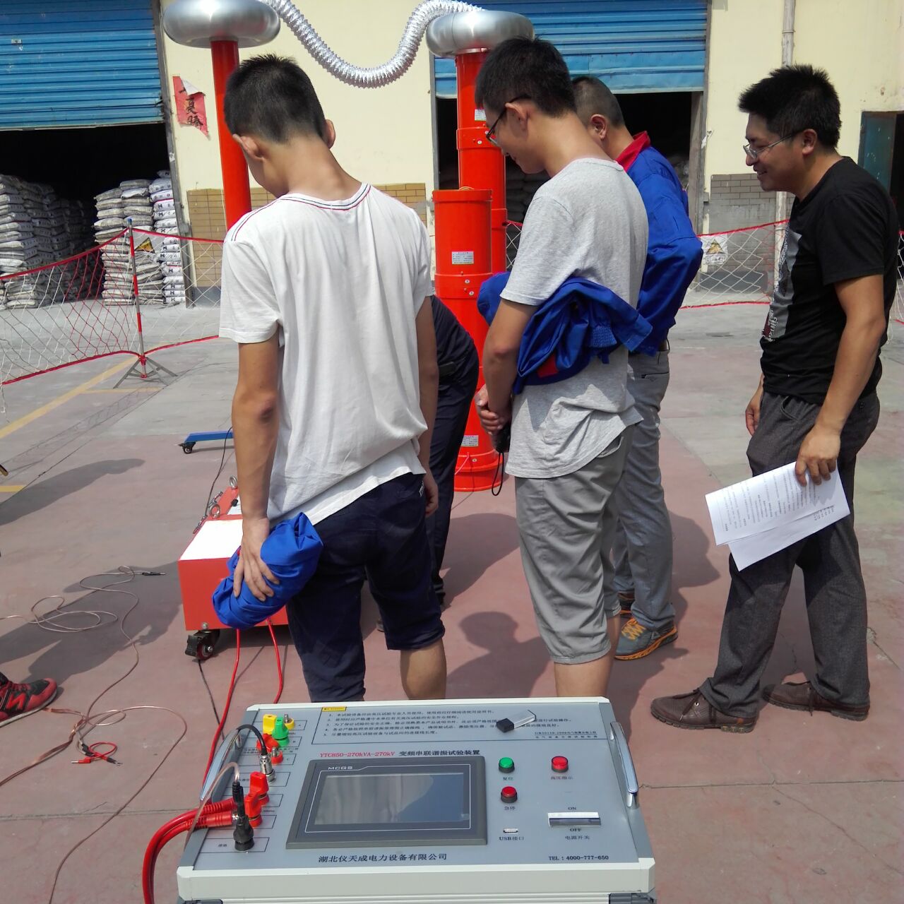 李工很快抵達現(xiàn)場,與客戶進行面對面的交流,了解客戶的需求和想法。然后開始講解設(shè)備,并認真講解怎樣安全操作設(shè)備。確??蛻裘靼琢税踩僮饕院?,李工帶領(lǐng)客戶一起做試驗——YTC850-270kVA/270kV變頻串聯(lián)諧振試驗裝置,YTCDG-1000A大電流發(fā)生器 這2套設(shè)備,其中這套變頻串聯(lián)諧振試驗裝置我公司的該設(shè)備為專利產(chǎn)品,諧振電源調(diào)頻及功率元件使用先進的日本進口的優(yōu)質(zhì)元器件,設(shè)計的是諧振式濾波電路,能改善輸出電壓的波形畸變,獲得很好的正弦波形,有效的防止了諧波峰值對試品的誤擊穿。變頻電源保護功能強,穩(wěn)定性好;具備具備全自動(自動調(diào)諧、自動升壓)、全手動(手動調(diào)諧、手動升壓)以及半自動(自動調(diào)諧、手動升壓及手動調(diào)諧、自動升壓)的多種工作模式,可任意切換使用;操作方便。
