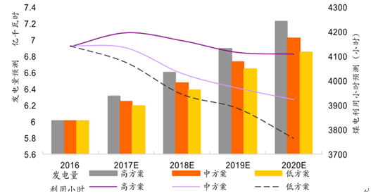 按照我國第十三個五年計劃的規(guī)劃,到2020年,我國的煤電的發(fā)電總量將會是11億千瓦,其占全社會的總發(fā)電量將進(jìn)一步縮減4%左右,2017~2020發(fā)電量及發(fā)電小時預(yù)測如下圖: