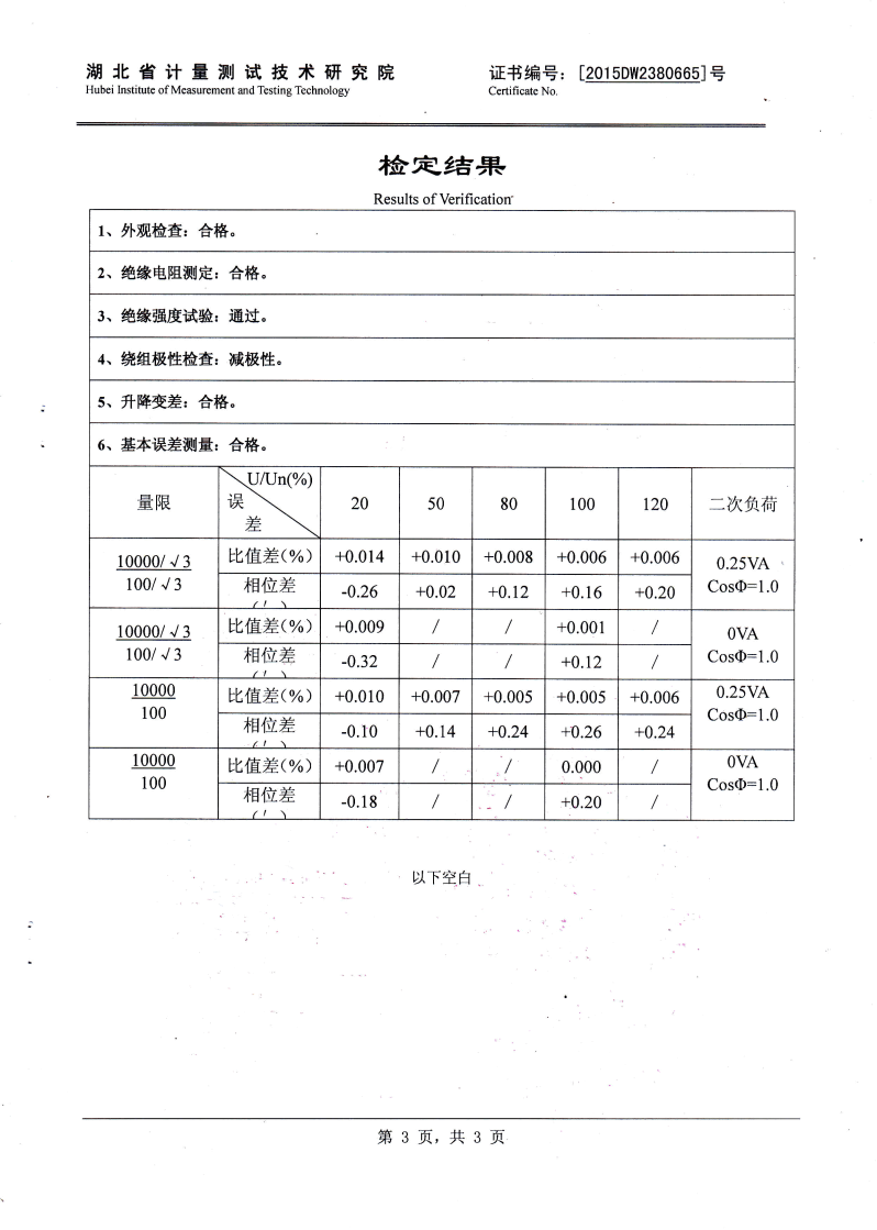 0.05級 即在額定負(fù)荷的情況下: 當(dāng)電壓為80%Un至120% Un的范圍內(nèi), 比差不大于0.05%,角差不大于2', 當(dāng)電壓為50% Un 時,比差不大 于0.075%,角差不大于3', 當(dāng)電壓為20% Un時,比差不大于0.1%, 角差不大于6'(實(shí)際誤差不大于誤差限值的60-70%)。 |