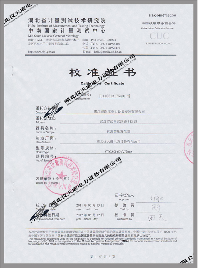 轉(zhuǎn)載:"YTCZG-60kV/2mA直流高壓發(fā)生器鑒定證書" 請(qǐng)注明來源于儀天成電力。 更多技術(shù)問題請(qǐng)致電儀天成電力客戶服務(wù):027-87876585,技術(shù)部專線:027-87876585,在線客服: