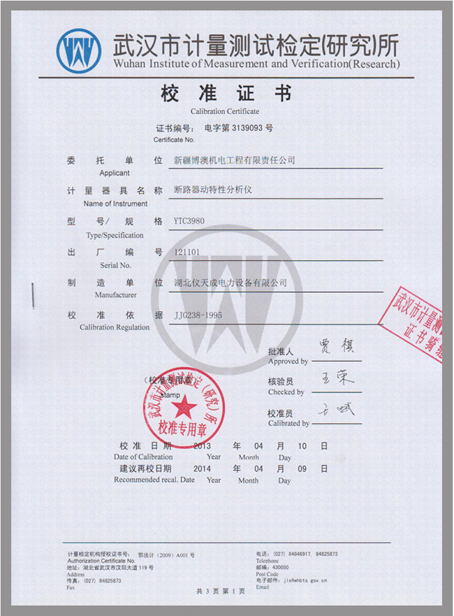 轉(zhuǎn)載:"YTC3980斷路器動特性分析儀鑒定證書" 請注明來源于儀天成電力。 更多技術(shù)問題請致電儀天成電力客戶服務(wù):027-87876585,技術(shù)部專線:027-87876585,在線客服: