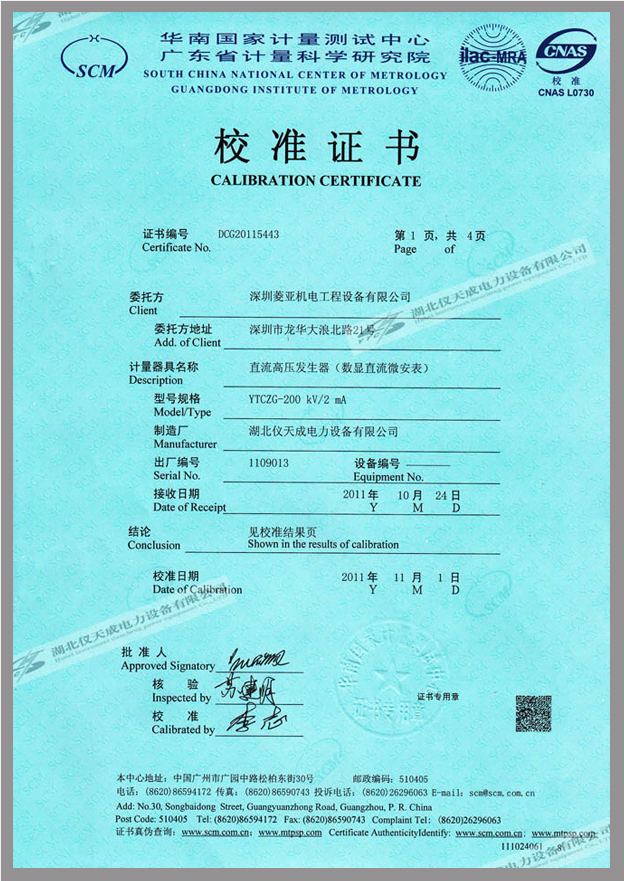 轉(zhuǎn)載:"YTCZG-200kV/2mA直流高壓發(fā)生器鑒定證書(shū)" 請(qǐng)注明來(lái)源于儀天成電力。 更多技術(shù)問(wèn)題請(qǐng)致電儀天成電力客戶服務(wù):027-87876585,技術(shù)部專(zhuān)線:027-87876585,在線客服:
